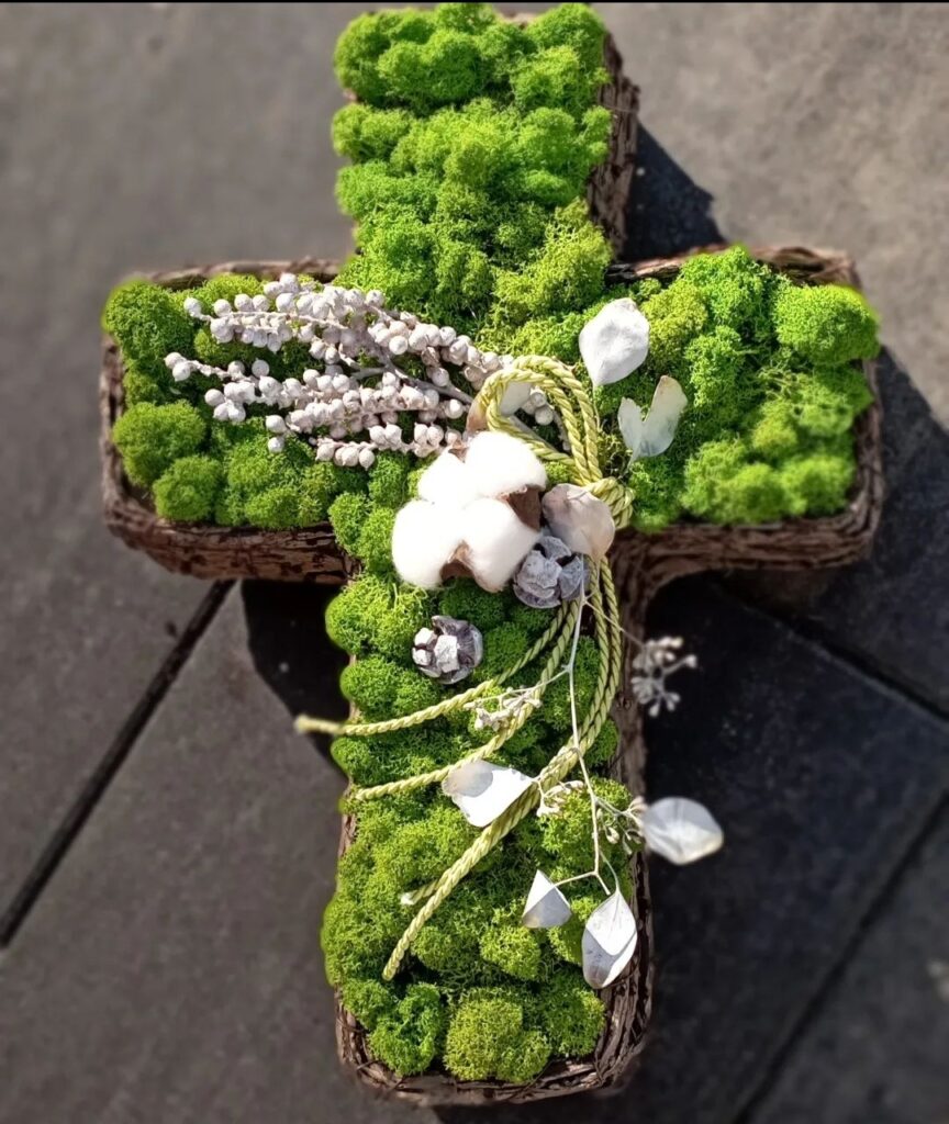 Proutěný korpus křížku vyplněný zeleným lišejníkem a doplněný o bílé přírodní dekorace. Hlavní dominantou je květ bavlníku a zelená stuha. Zářivá dekorace nejen na hrob či k urnovému místu.